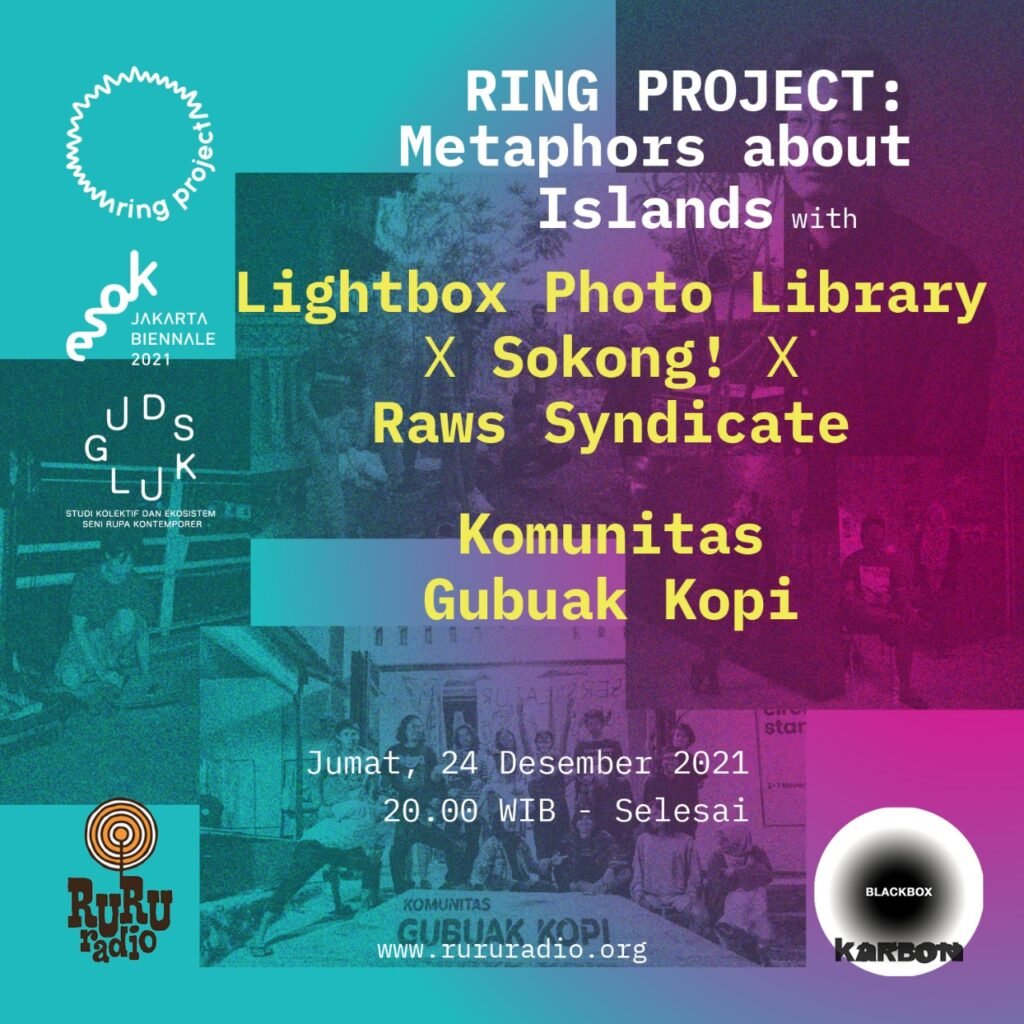 Still with Ring-Project, tonight BLACKBOX KARBON will hang out with friends from Lightbox Photo Library, SOKONG! and RAWS SYNDICATE, and Gubuak Kopi. The first three art collectives mentioned collaborate to examine the meaning of contemporary circulation, its basic requirements, and explore the dialectical relationship between circulation and possibility. Meanwhile, Gubuak Kopi’s work tries to read the cosmology of Kampung Jawa in Solok, West Sumatra, which they call JAMBAK Cosmology. What is JAMBAK? And, what kind of contemporary circulation are examined by Lightbox Photo Library, SOKONG! and RAWS SYNDICATE in their collaborative project? Don’t miss BLACKBOX KARBON tonight!